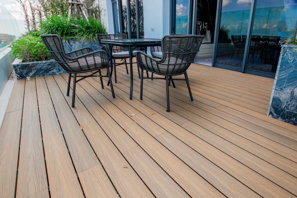 - Eine moderne Alternative stellt WPC (Wood-Plastic-Composite) dar. Hierbei handelt es sich um ein spezielles Verbundmaterial, das aus Holz und Kunststoff besteht. Es punktet mit einer ansprechenden Optik, ist widerstandsfähig und erfordert kaum Pflegeaufwand. Dementsprechend stellt WPC einen gelungenen Kompromiss zwischen Natürlichkeit und Funktionalität dar.